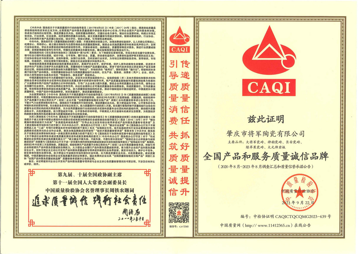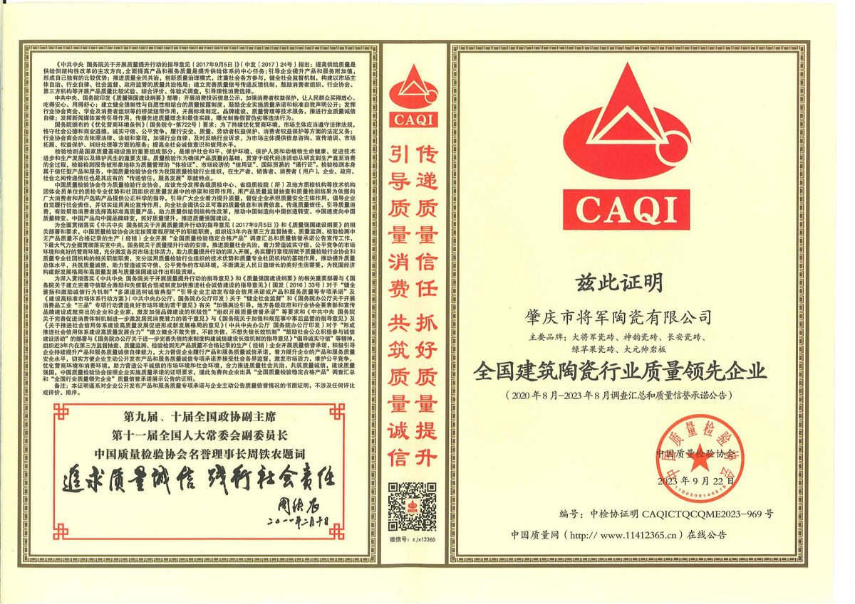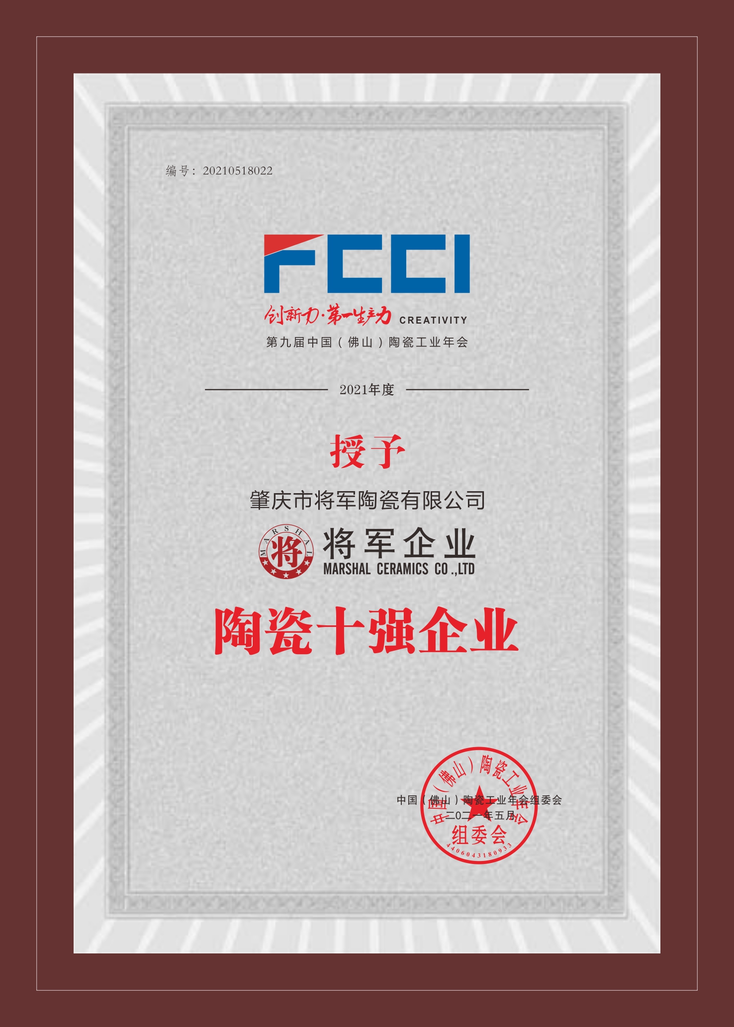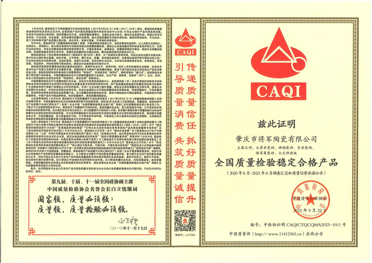 2021年5月 由中国(佛山)陶瓷工业年会组委会主办,将军企业荣获佛山陶瓷百家“质量共治”与诚信承诺品牌、陶瓷十强企业,慕岚岩板荣获岩板十强品牌,大将军陶瓷荣获陶瓷十大品牌;