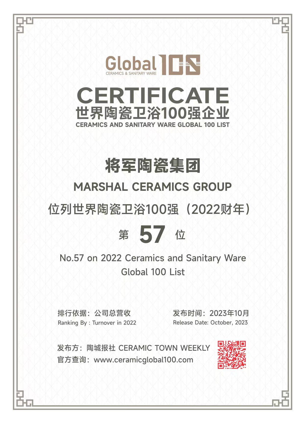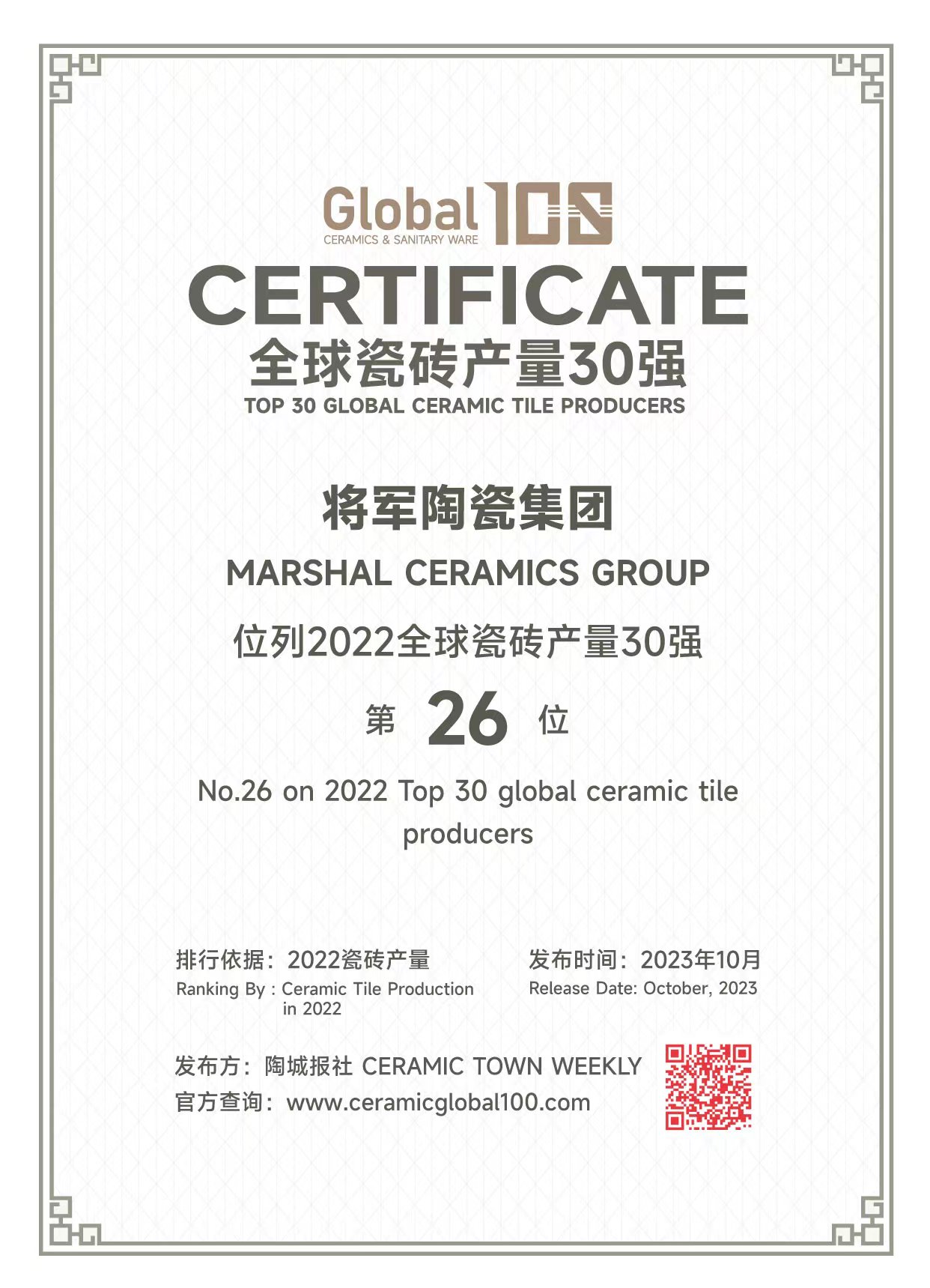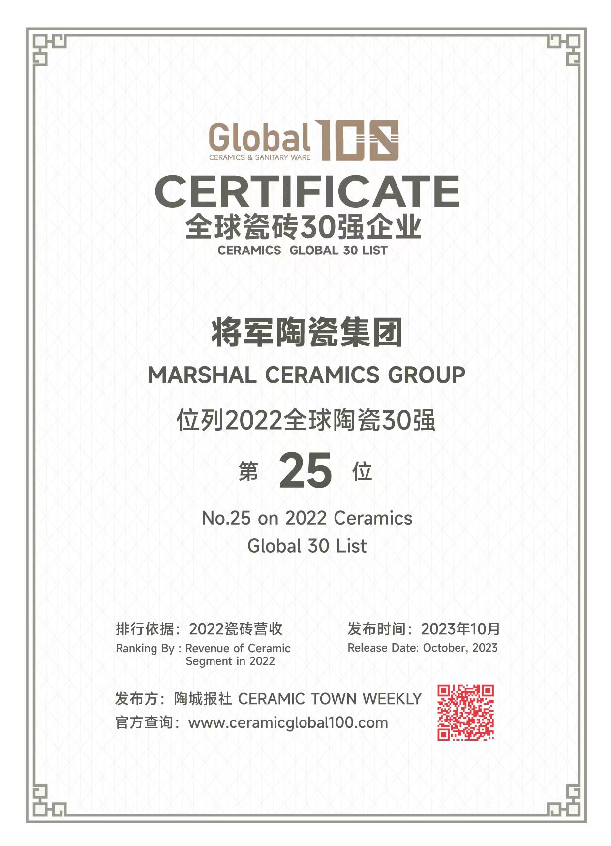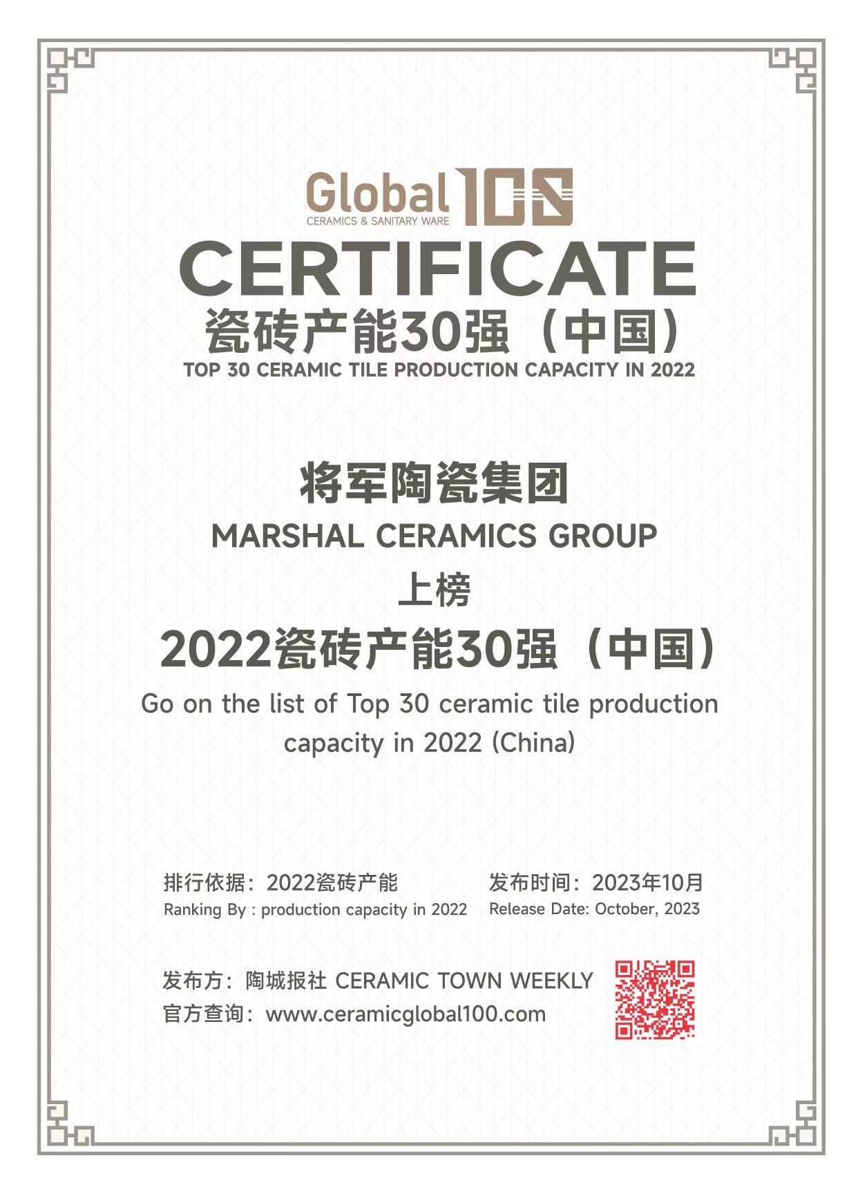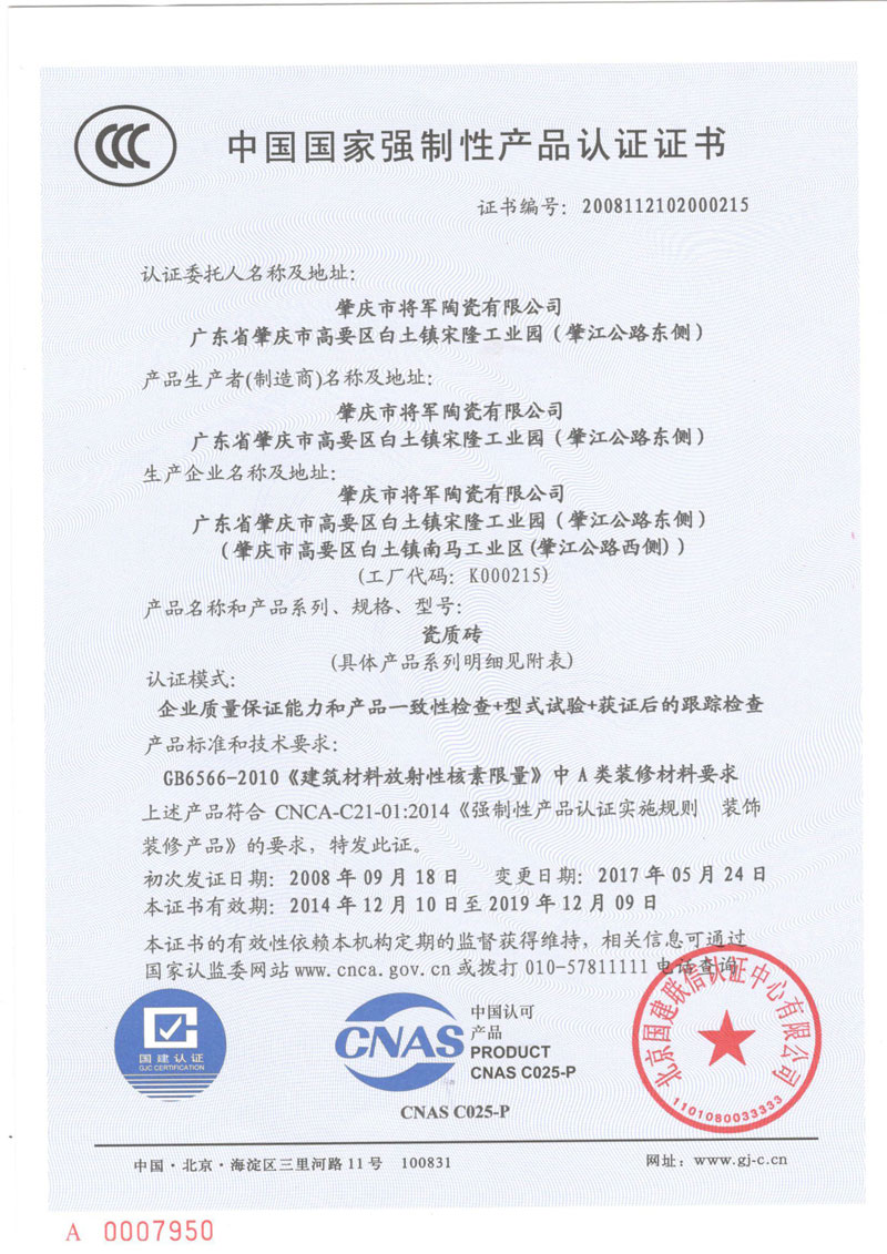 2020年6月 大将军荣获“中国500最具价值品牌”,品牌价值达116.39亿元;长安瓷砖荣获“中国500最具价值品牌”称号,品牌价值达90.25亿元。(206.64亿元)